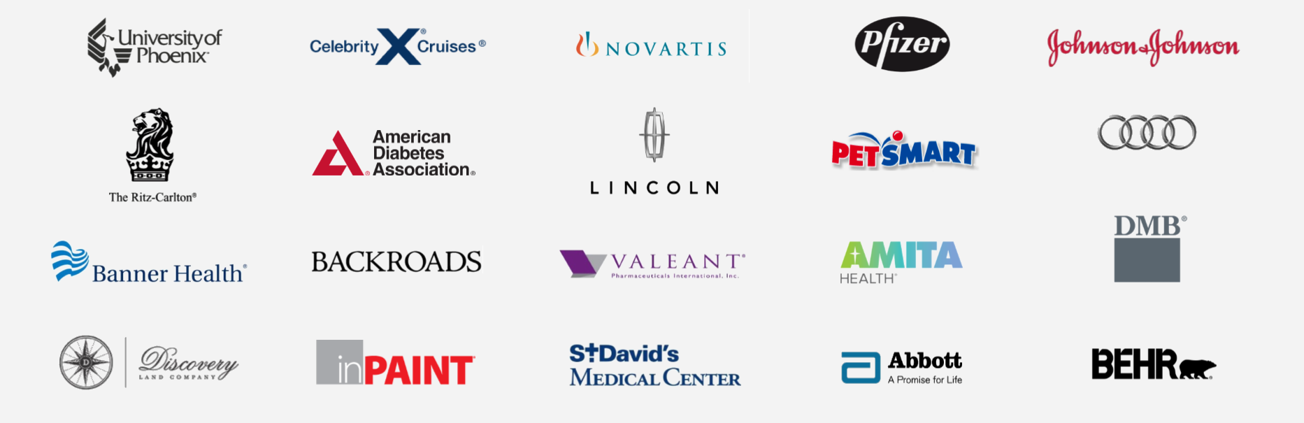 Abbott Laboratories / Alexian Brothers Healthcare / American Diabetes Association /AMTIA Health/ Arizona Department of Education / Audi of America / Backroads / Banner Health / Behr Process Corporation / Boehringer Ingelheim / Celebrity Cruises / City of Phoenix / City of Scottsdale / CVS Caremark / Del Webb Communities / Discovery Land Company / DMB Properties / Giant Industries / GMC Trucks / Hilton Hotels & Resorts / Honda USA / Horizon Pharma / inPAINT / Jaguar USA / Johnson & Johnson / LifeScan / Lincoln / Masterchem / Medicis Aesthetics / Novartis / PetSmart / Pfizer / Reston Hospital Center / Rex Healthcare / Rockford Fosgate / Rockwell Collins / San Jose Medical Center / Siemens Medical Solutions / Silverleaf Properties / Sonofi-Aventis / St. Davidโs Healthcare / St. Johnโs Healthcare / Talecris Biotherapeutics / Tenet Healthcare / The Ritz-Carlton / University of Phoenix / Valeant Pharmaceuticals